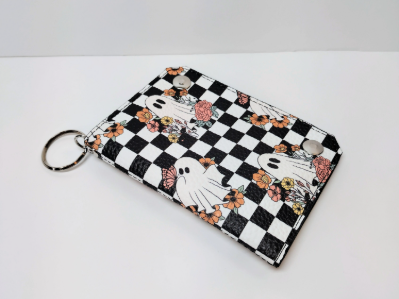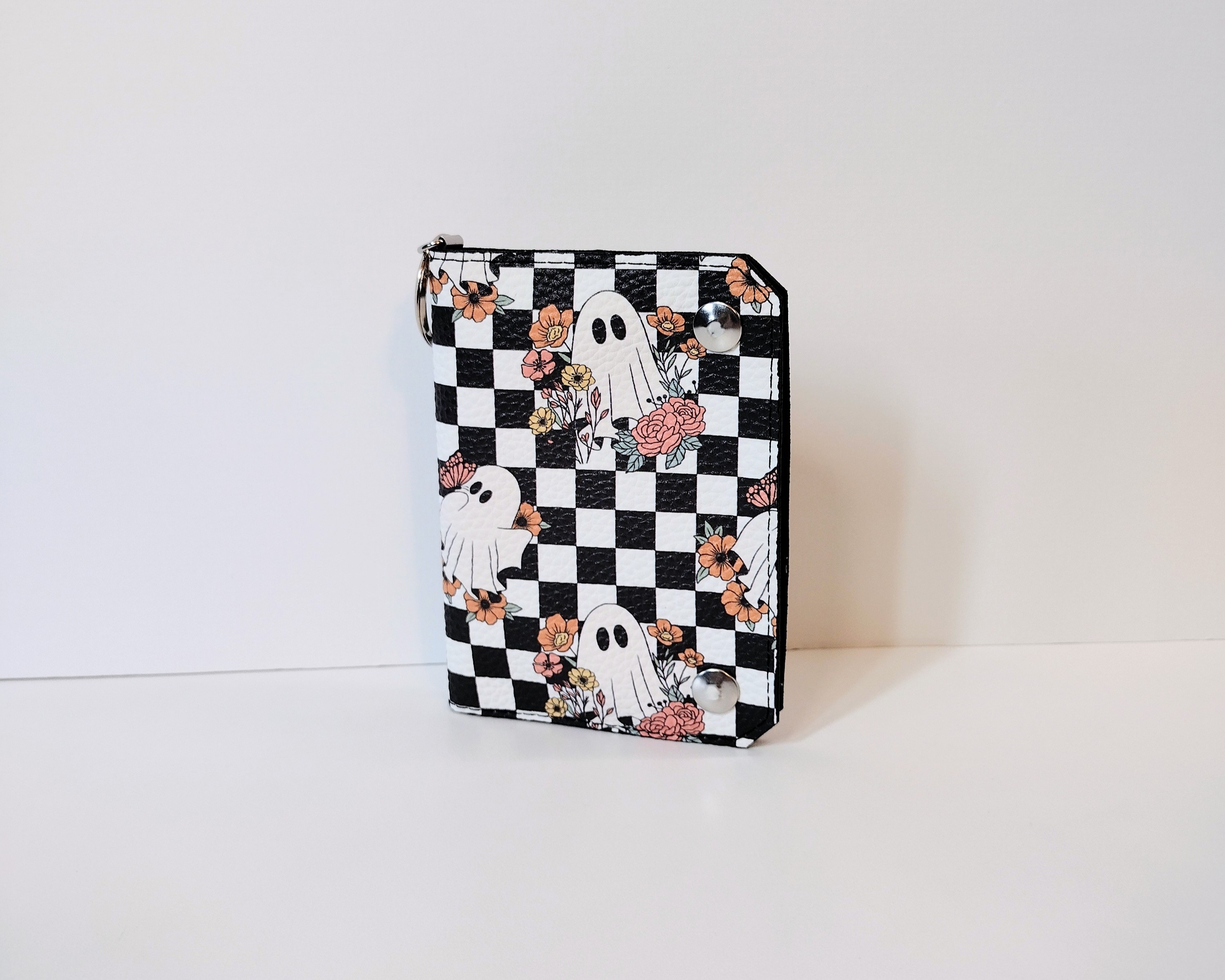 Exterior made with a pebbled vinyl print of ghosts and florals with checkerboard background; back exterior features a secure, clear vinyl ID window