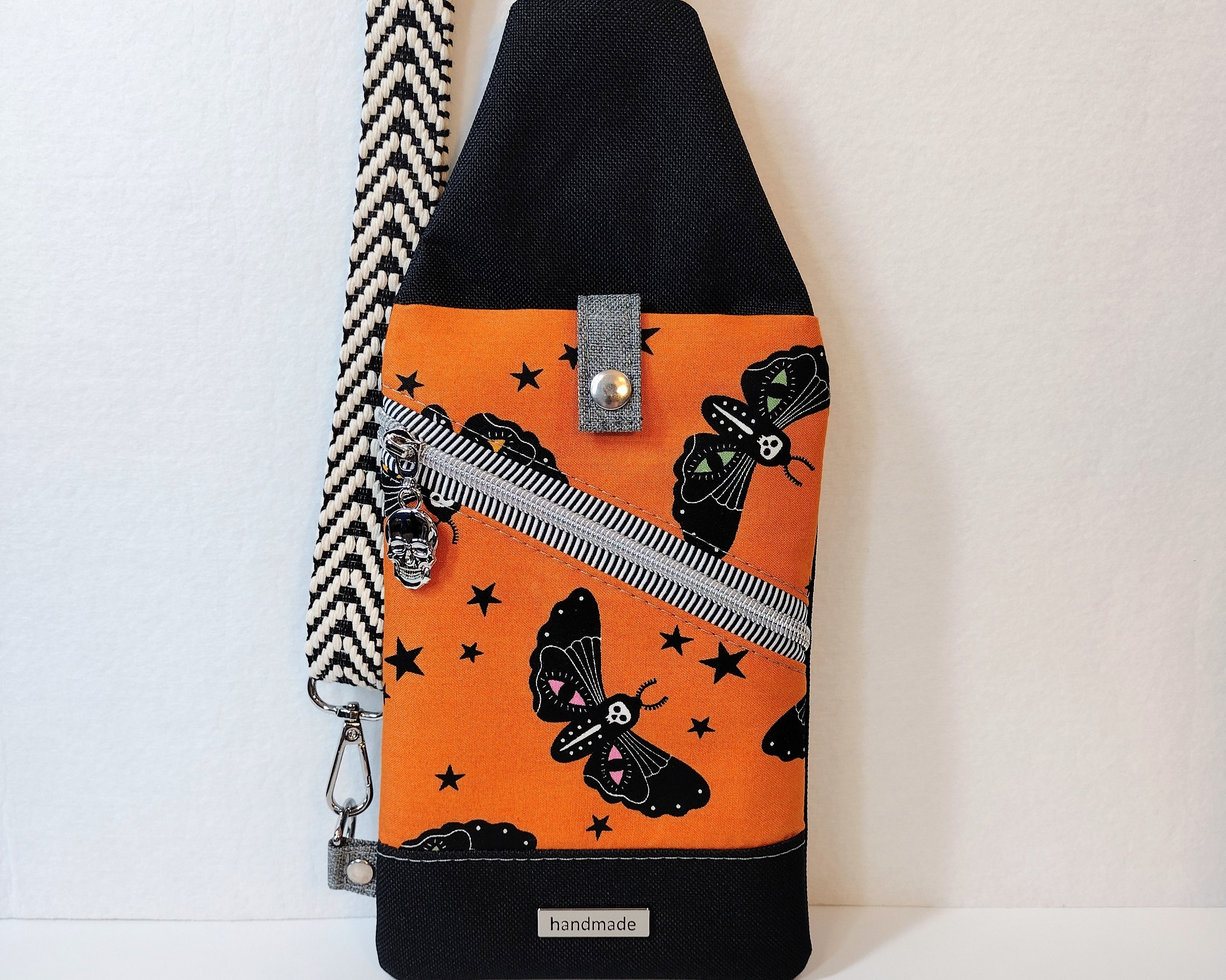 Made with a moth & skulls orange cotton print and durable heathered black canvas