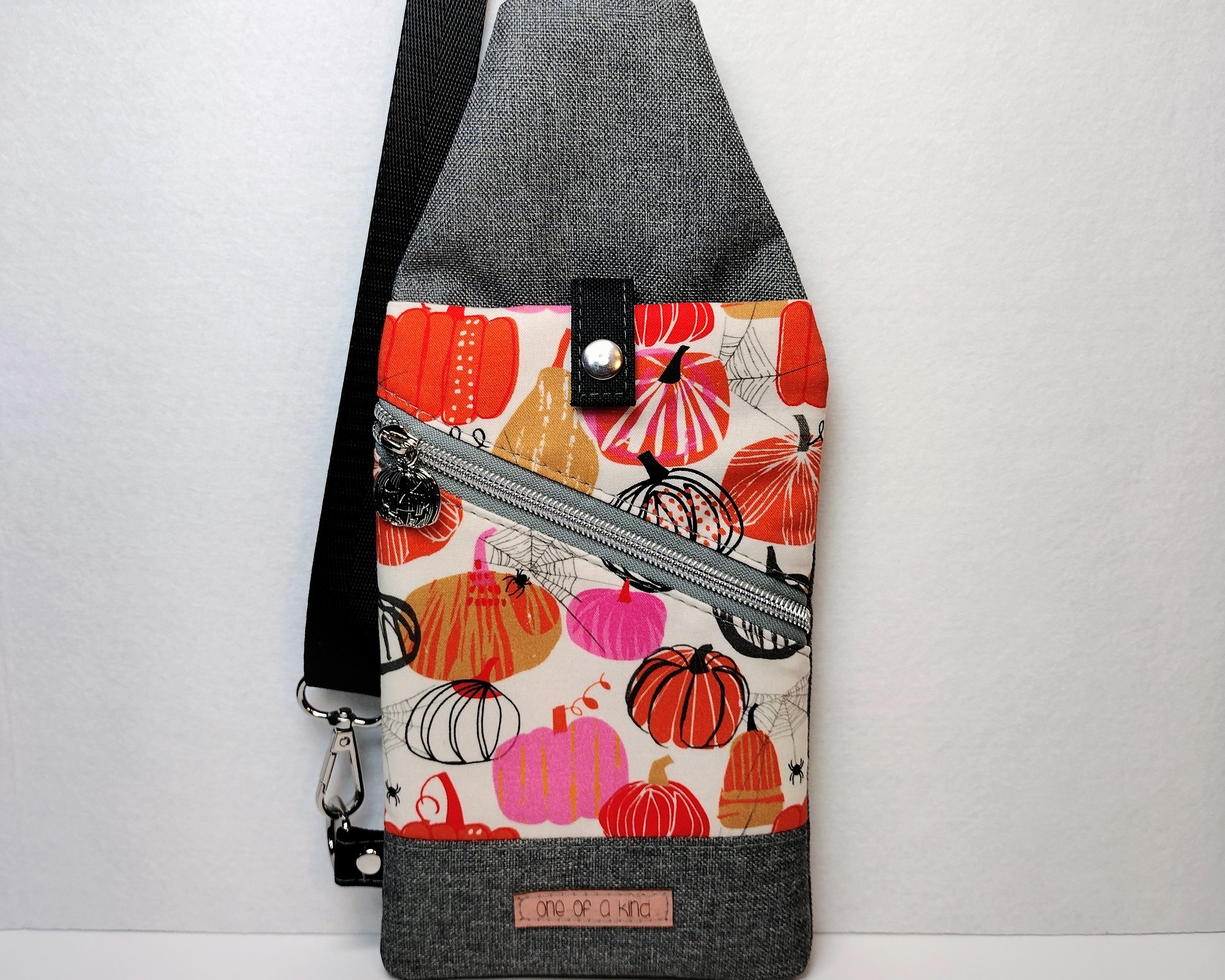 Features a front zipper pocket with a jack-o-lantern zipper pull and a front slip pocket (with snap for security), which holds even the largest of phones